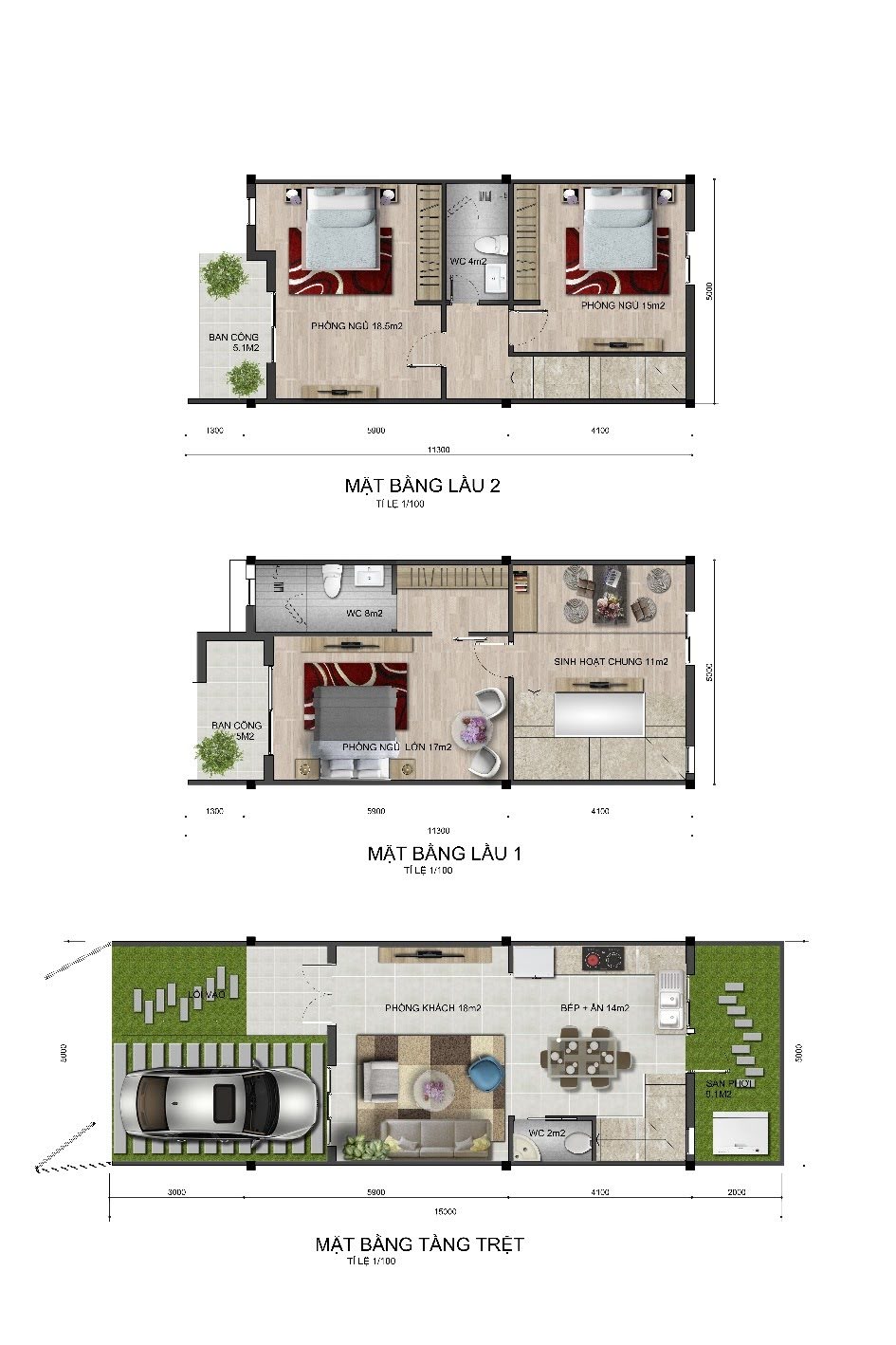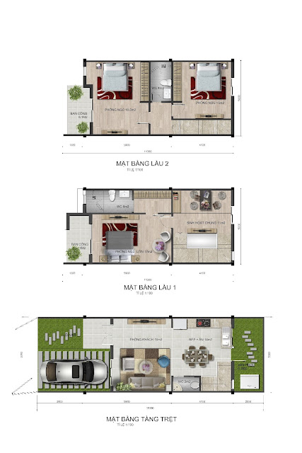 - Thiết kế 1 trệt, 2 lầu, 3 phòng ngủ